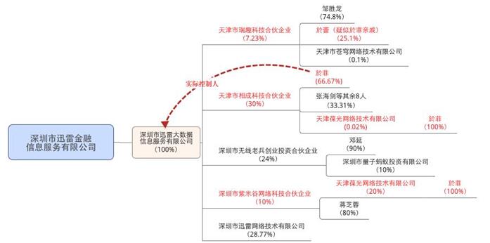 可供查询的备案信息显示,迅雷大数据公司在2017年1月10日发生股权变更,原第一股东深圳市迅雷网络技术有限公司股权比例下降至28.77%,并失去董事会席位。新的第一股东为天津市相成科技合伙企业,持股比例30%。继续查询可知,天津市相成科技合伙企业有八个股东,天津葆光网络技术有限公司与於菲占大多数股份,其中於菲个人持股达66.67%。继续查询天津葆光网络技术有限公司的话,於菲持有这家公司100%的股份。这就很简单了,股权或者利益是真实的,於菲是天津市相成科技合伙企业的最大股东,也是迅雷大数据公司股权变更背后的最大受益者。