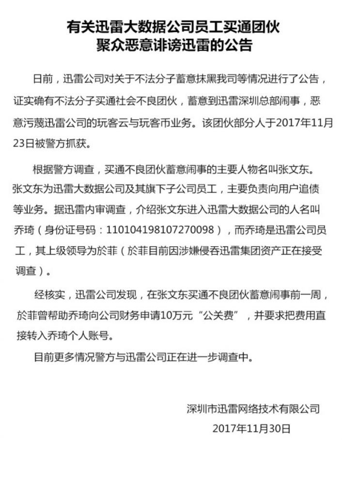据迅雷集团今日最新的公告显示,迅雷大数据公司员工买通团伙聚众恶意诽谤迅雷,背后指向的就是於菲。警方调查显示,曾于11月22号到迅雷集团闹事的人,既不是玩客云用户,也不是迅雷的投资者,与迅雷公司及迅雷产品不存在任何关系,并且有证据指向於菲授意他人组织闹事。组织闹事的人为迅雷大数据公司的员工,并且已经在11月23日被警察抓获,而介绍他进迅雷的正是於菲的下属,且在团伙闹事前一周发生了10万元的资金往来。可以断定,迅雷大数据公司透露的不利于迅雷集团的信息,也是於菲有意制造的。