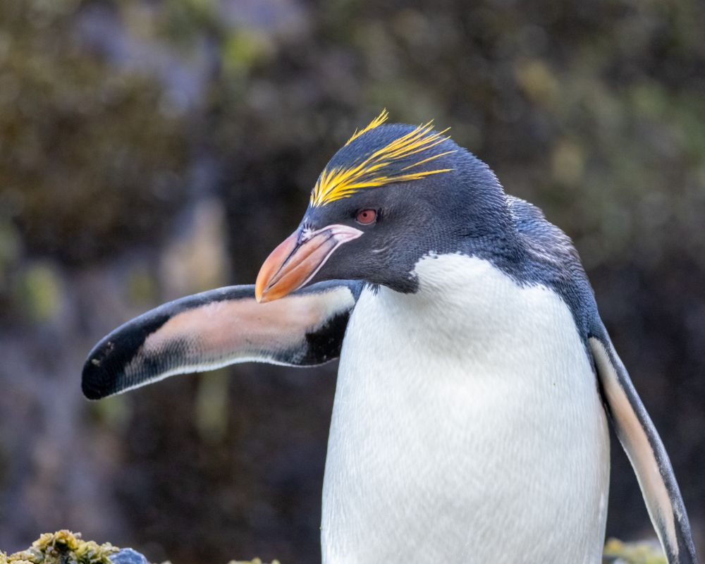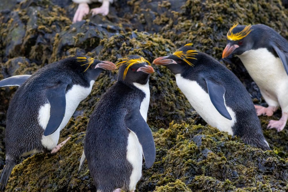 新年第一天的清早,我们乘冲锋舟在埃尔斯浩湾(Elsehul Bay)里遇见了此行唯一一次见到的通心粉企鹅(Macaroni Penguin),非常漂亮的潮鸟,一头金发飘逸时髦,帅呆了!滑稽的是一大群通心粉企鹅里,居然混着几只巴布亚企鹅,它们头上可没有金发飘逸。不知道是巴布亚企鹅想高攀呢,还是捕虾时混群了?反正游着游着,通心粉企鹅扭头一看吓一跳,这里的虾米厉害呀!把这几只同伴的金发都咬秃了!