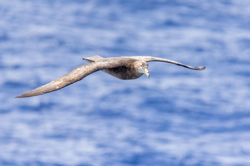 在船尾拍飞鸟是另一挑战,因为我的400mm f5.6加1.4x太难对焦了,飞鸟几乎就是在镜头前一闪而过,所以成功率非常低,大概千分之一吧。南极海域最著名的飞鸟当然是信天翁了(Albatross),翅展达7呎,比我双臂打开还长,体格也几乎接近小狗。不太出名的是巨鹱(Giant Petrel)度娘的翻译是大海燕,体格和翅展与信天翁不相上下,稍差的是颜值,所以默默无名。这次的旅游取消了福克兰群岛的行程,所以能拍到飞翔的信天翁希望不大了,仅在冲锋舟上拍到了一只戏水的信天翁。经过几天在寒风里的搏斗,终于拍到了飞翔中的Giant Petrel。也拍到了蓝鹱(Blue Petrel)其实蓝鹱更难拍到,因为它们小,飞得快,而且变向似乎毫无规律。