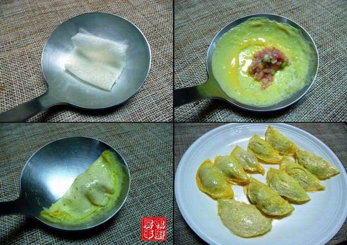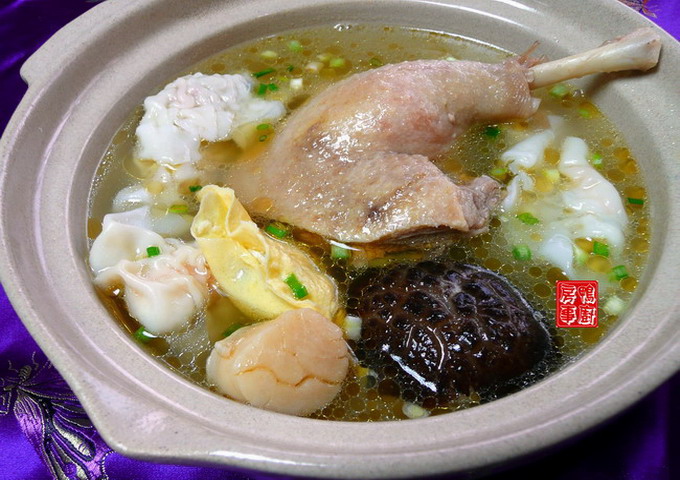 鸭半只放进5饭碗水里加葱/姜/料酒熬煮40分钟,鸭胸另有用途。 云吞 : 瘦肉/肥膘/花菇/虾切细,加葱/姜/蒜容,少许料酒/蛋青/麻油/料酒/盐/鸡精/酱油充分搅拌均匀,虾仁切段,包成云屯。 蛋饺 - 用汤勺煎蛋皮,加少许云屯料做成蛋饺。 花菇/干贝泡软蒸软。 两饭碗鸭汤放进沙锅烧开,放进鸭腿/云吞/蛋饺/花菇/干贝烧煮15分钟,加盐调味,撒葱花,滴麻油即可.