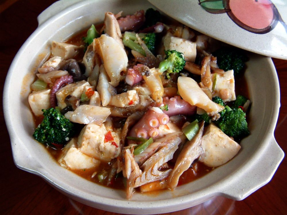 做法 :一大匙油烧热,放入辣椒,菇菌,韩国辣豆酱,辣豆辩酱拌炒片刻;加高汤,豆腐,料酒/麻油/香醋烧开;煮约十分钟后加太白粉水勾嵌,放进鲍鱼片,章鱼段,黄花鱼肉,椰花菜拌均即可。