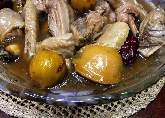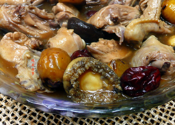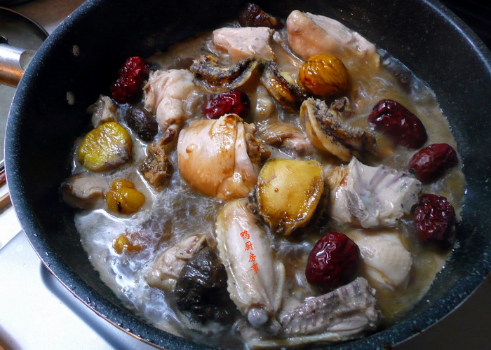 材料 :鸡一只斩块,鲜鲍鱼四只打理干净,烤栗子,香菇,红枣。