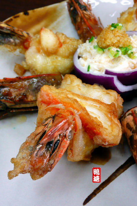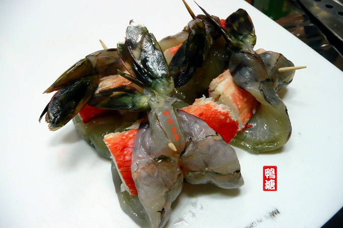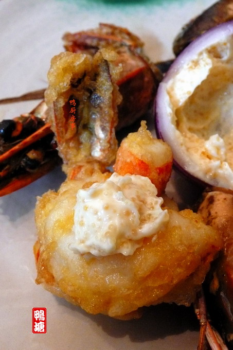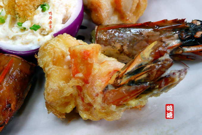 海鲜不见得一定是生猛货,像这种冷冻的帝皇蟹腿就是buffet table的常客,谈不上什么鲜美味;而这种养殖的草虾块头虽然大,但味道却不怎么样。。。既然吃的不是鲜美味,用来炸最适合了,孩子们特喜欢。