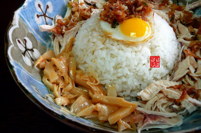 台湾有一道著名小吃叫“嘉义鸡肉饭”,是将新鲜火鸡肉加入调料炒熟后,与米饭放在一起,淋上鸡汤即可食用的一道亦菜亦饭美食。鸡肉饭含有丰富的蛋白质,即可做为主食也可当做宵夜食用。
