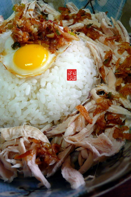 3. 盛一饭碗米饭,倒扣入大碗里,摆进鸡丝,一个煎鹌鹑蛋,油嫩笋,淋上少许鸡汤,铺上油葱酥。