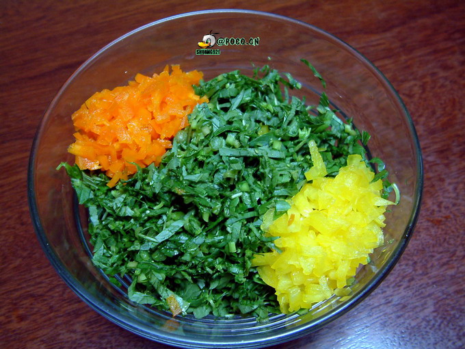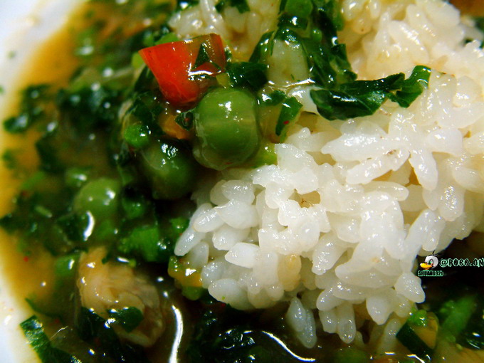 绿茵羹做法 :花蛤半斤烫熟起肉(汤留用);杏菜一把(或其它绿叶嫩蔬菜)切细;甜椒切末;青豆仁少许;红辣椒一条切片。