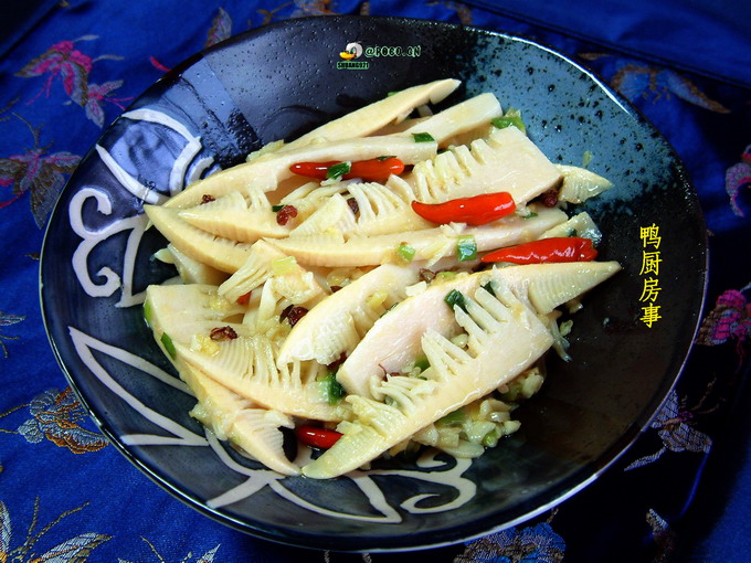 2。起油锅,下辣椒炒香,续放花椒,葱姜蒜末略炒,放入竹笋炒匀,加入盐,稍许砂糖调味,然后勾薄芡,起锅装盘即可。