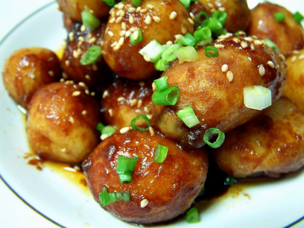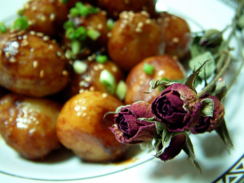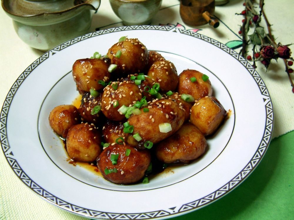 酱烧土豆 - 迷你土豆削皮;两大匙油烧热,放进土豆,适量糖,蚝油,酱油翻炒,注入少许高汤,上盖焖煮20分钟,转旺火烧煮至汤汁收干,撒芝麻,葱花即可。