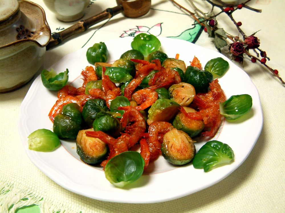 红油虾米卷心菜 - 迷你卷心菜切对半泡洗干净,烫飞水断生后捞起沥干;一大匙油烧热,放进虾米爆香,加入卷心菜,蚝油,盐,红油,少许高汤拌炒至汤汁收干即可。