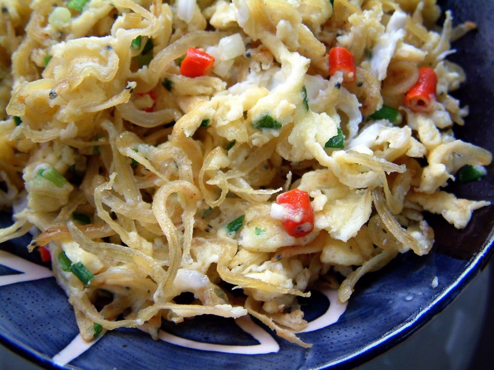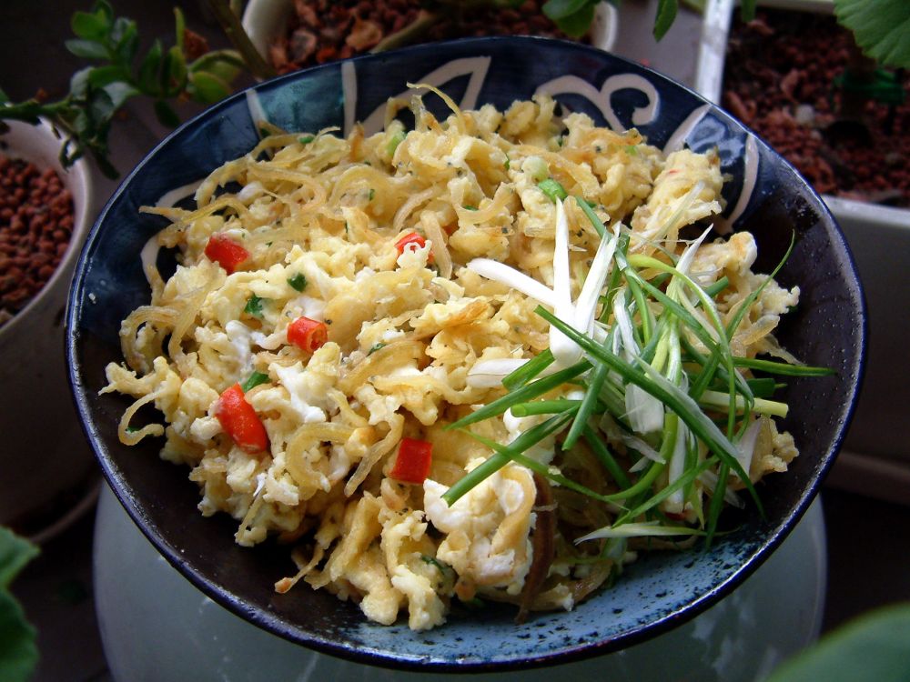 蛋炒小鱼干 - 小鱼干泡洗干净沥干;鸡蛋加葱花,泡椒,盐打成蛋液;两大匙油烧热,放进小鱼干翻炒片刻后倒进蛋液拌炒至干身即可。