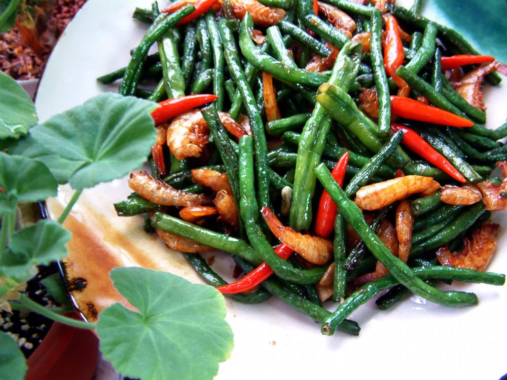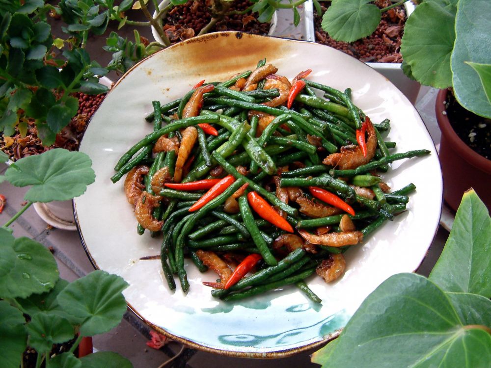 炒四季豆 - 四季豆洗净切段;两大匙油烧热,放进蒜片,虾米,泡椒爆香,加入四季豆,蚝油,糖,盐翻炒,注入适量高汤继续拌炒至汤汁收干即可。