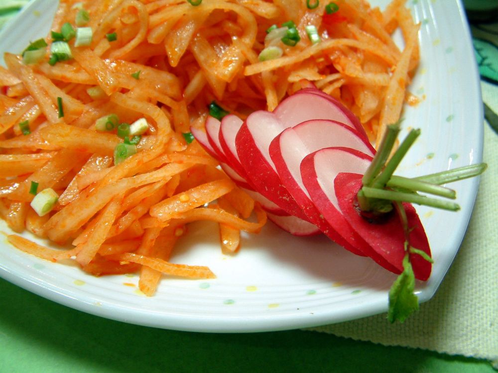 凉拌疙瘩菜 - 疙瘩菜洗净削皮切丝,用少许盐腌制30分钟后泡洗干净挤干水分。拌进红油/鱼露/糖/泡椒腌制一小时即可。