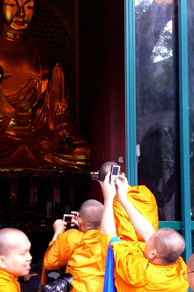 大师们看到金身佛像后立马情绪失控,从僧袍里掏出小机机,争先恐后的一轮狂拍,合照/selfie/“cheese”。。。