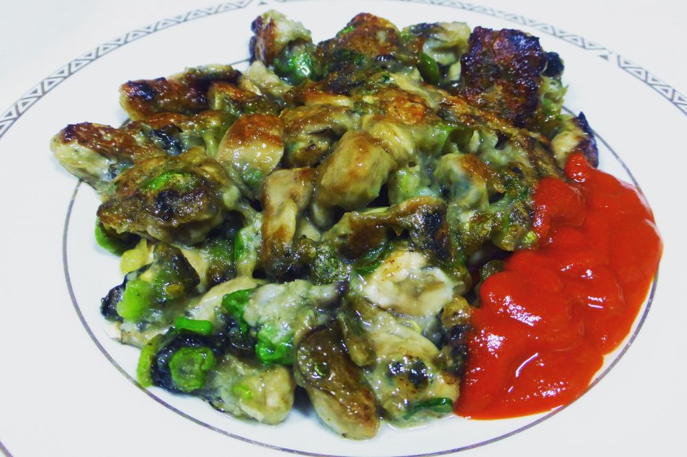 这是最简单的做法:牡蛎洗净后抹干水分,加适量太白粉/胡椒粉/精盐/葱花/辣椒末拌均煎熟即可。