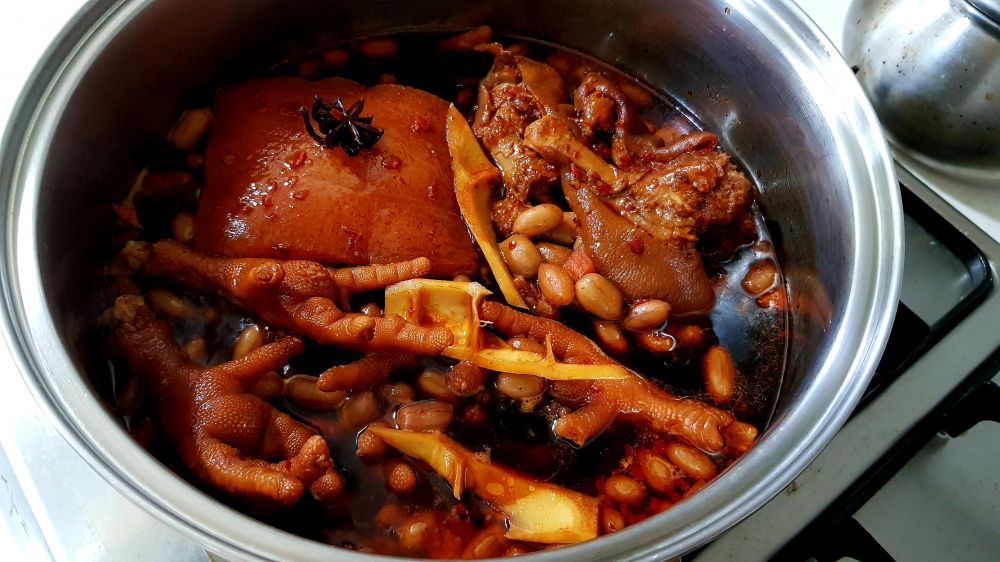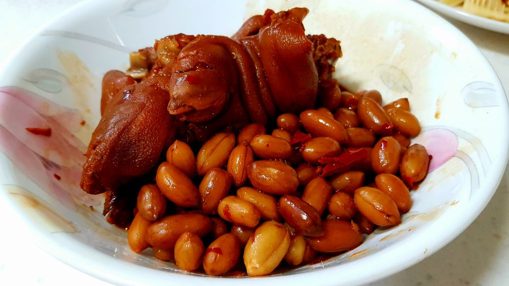 一锅清水加葱结/姜/料酒烧开,放进五花肉方块/猪蹄/鸡爪川烫几分钟后捞起,冲洗干净备用,汤汁倒掉。半锅清水加一个卤包,一块拍裂的姜,葱结,2颗八角烧开,放进五花肉/猪蹄/鸡爪/笋/花生(需事先用清水浸泡1-2天),在烧开后转中小火煮60分钟,加入适量生抽/老抽/料酒/冰糖/2大匙麻辣香锅酱料,继续烧煮60分钟即可。这道卤菜凉却结冻都风味更好。