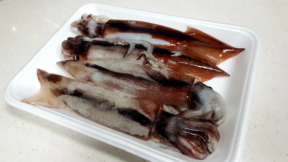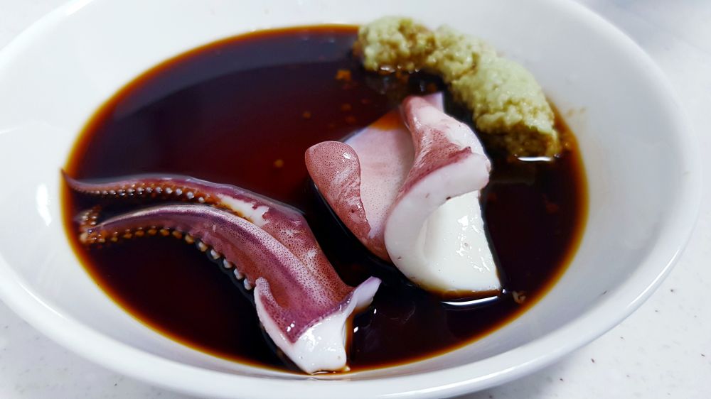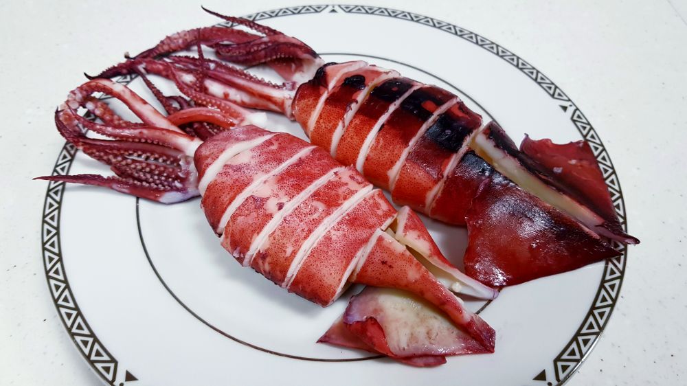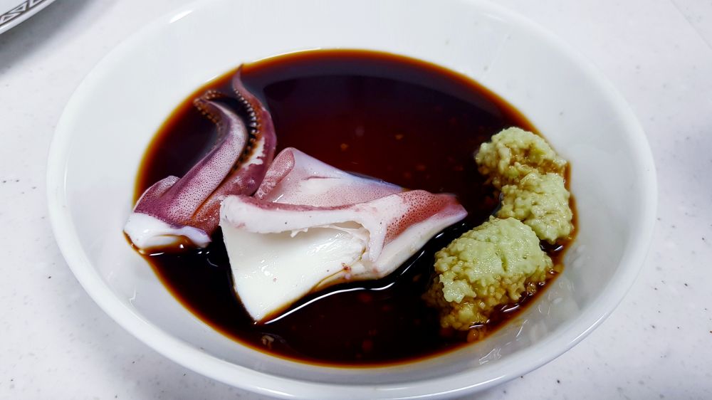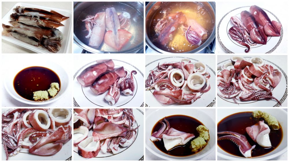 买了四只鱿鱼,两只做了盐焗,这两只白灼。简单的放进滚水里烫2-3分钟即可,口感Q弹脆嫩,十分鲜美,蘸芥末酱油或海鲜辣酱都行。