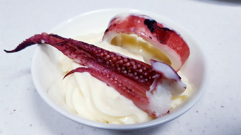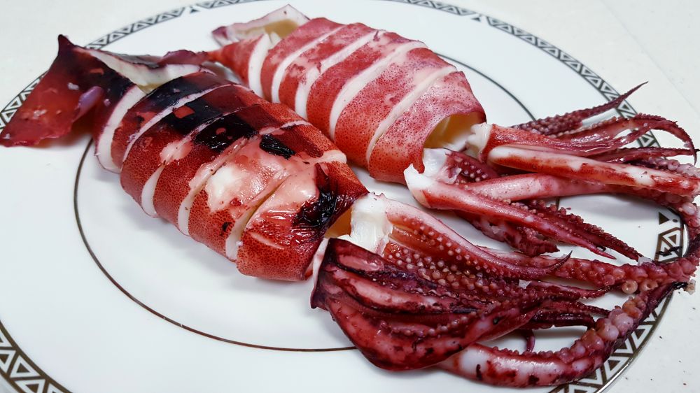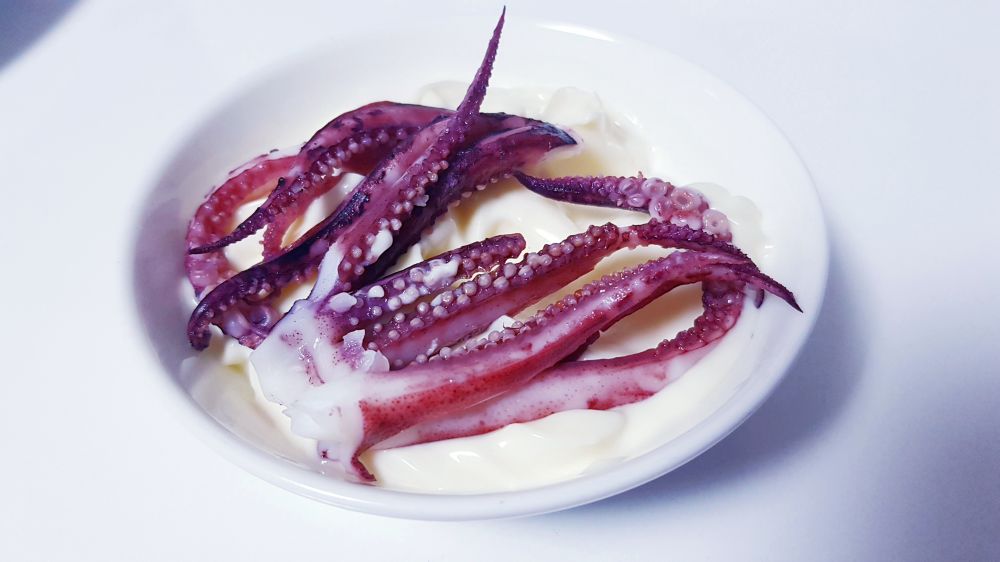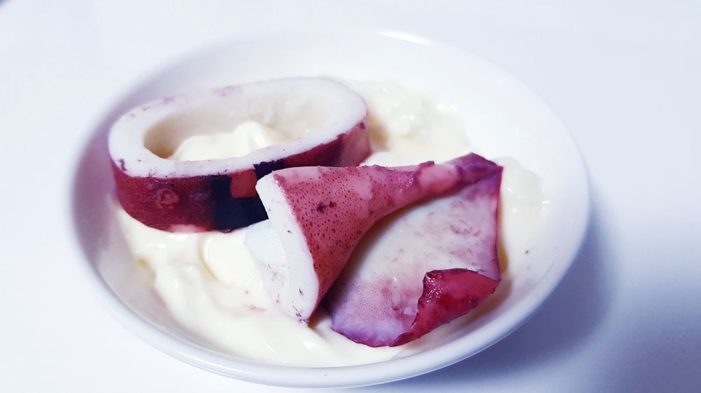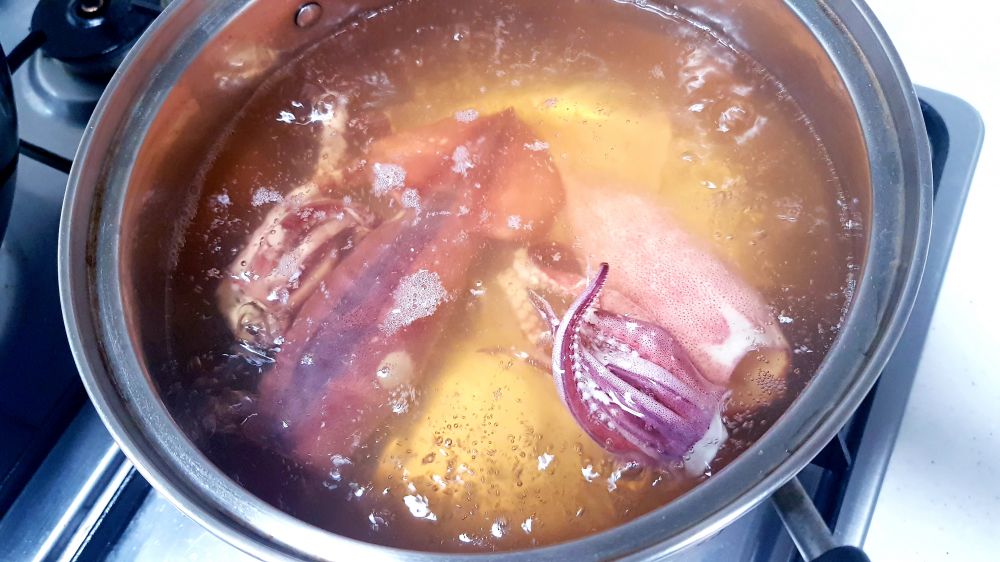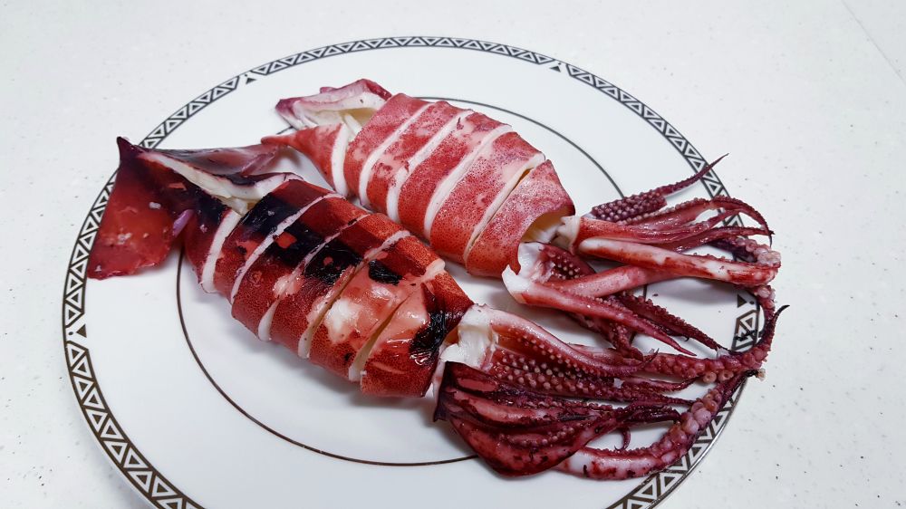 买了四只鱿鱼,两只做了盐焗,这两只白灼。简单的放进滚水里烫2-3分钟即可,口感Q弹脆嫩,十分鲜美,蘸芥末酱油或海鲜辣酱都行。