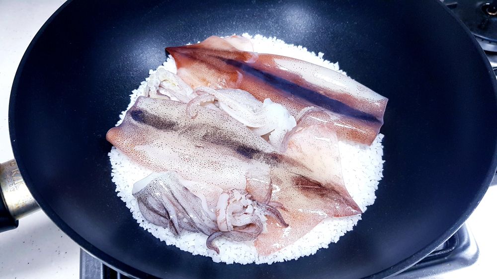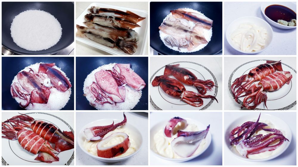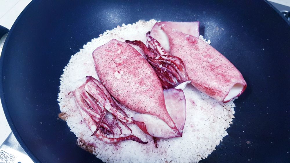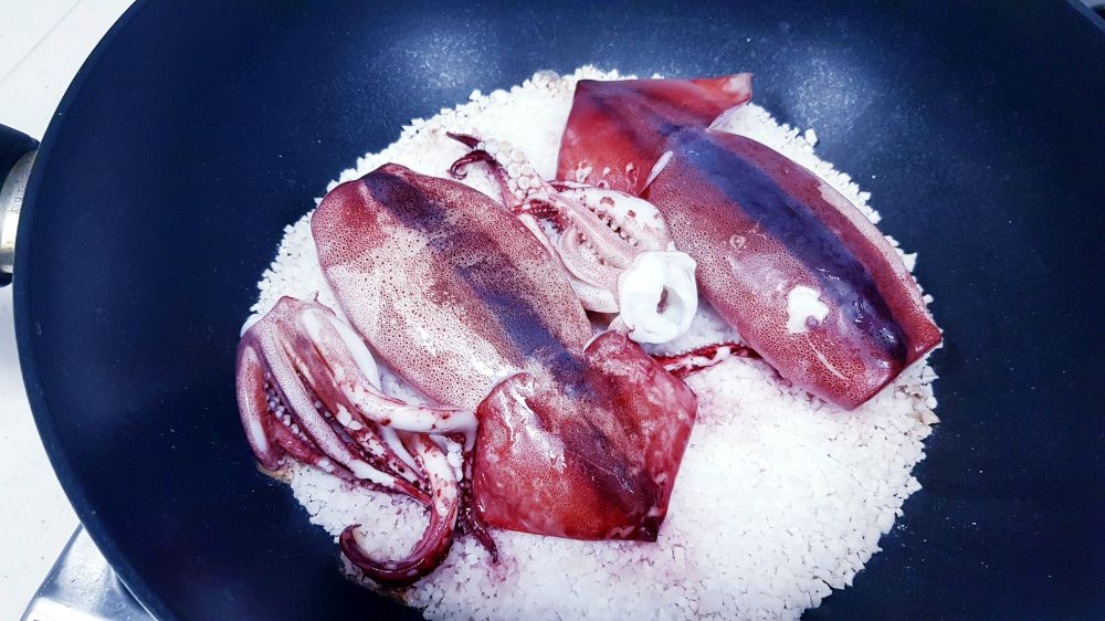 鱿鱼打理干净抹干水分。锅里铺上一层粗盐,摆上鱿鱼。。。