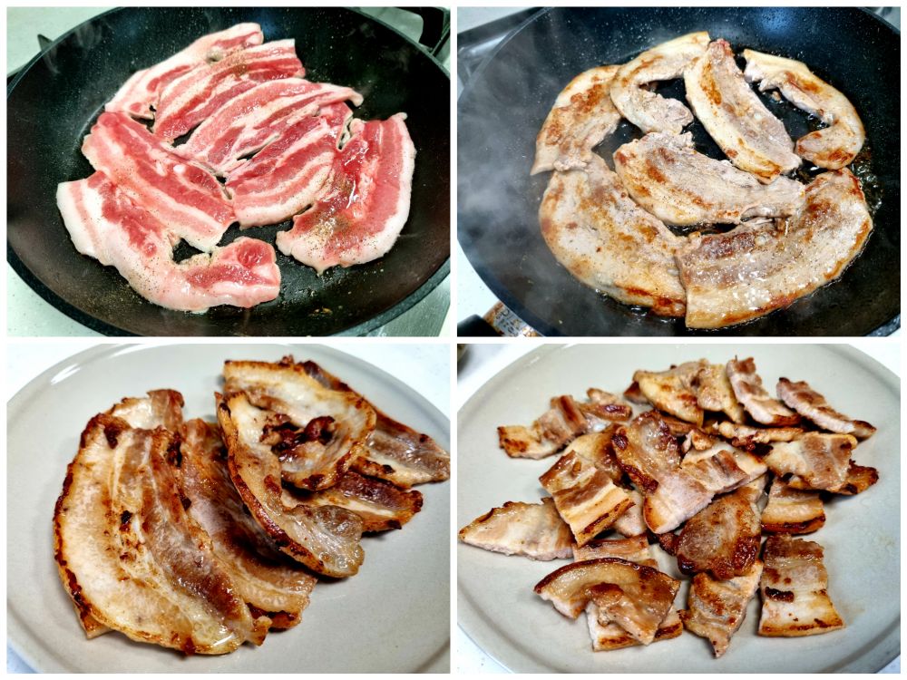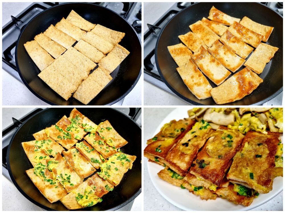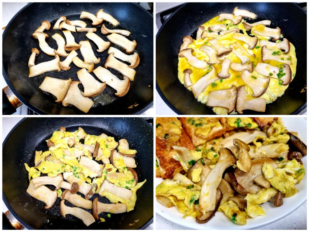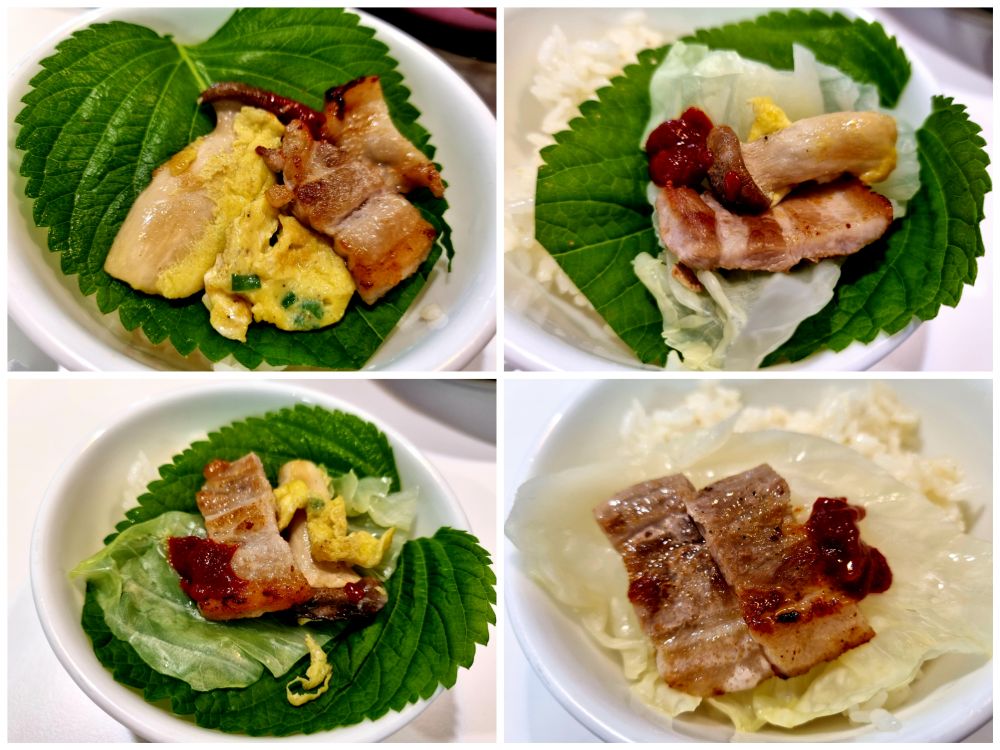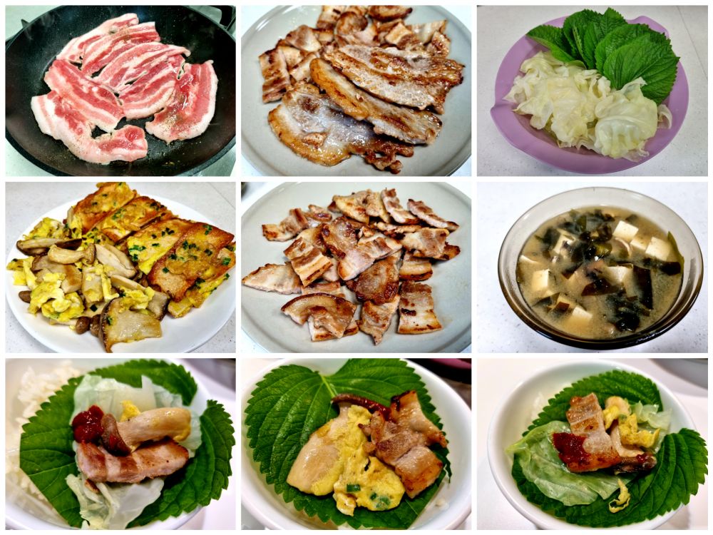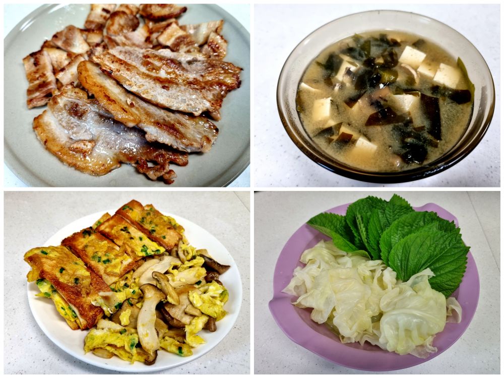 生煎五花肉,蛋煎鱼饼,蛋炒菌菇,miso soup