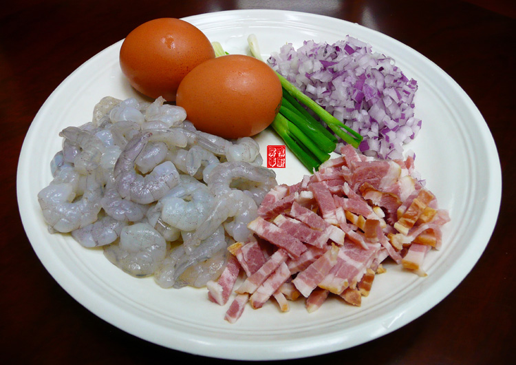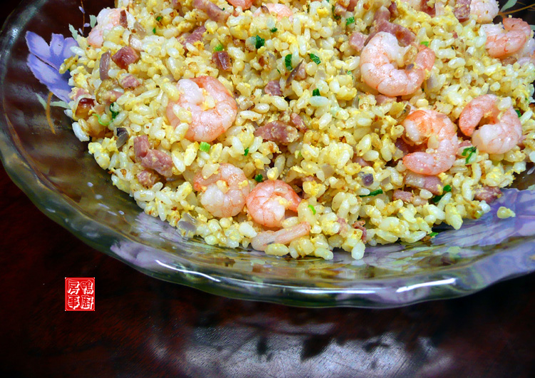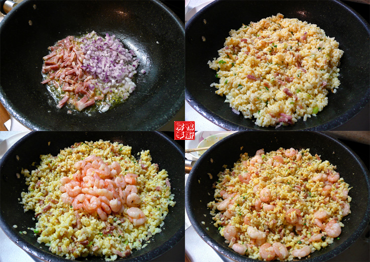 材料 :米饭两饭碗,虾仁(剔肠后用少许粗盐抓过,冲洗干净,抹干水分),带肥火腿切细,洋葱切细丁,葱花,油葱酥,鸡蛋两个打散。