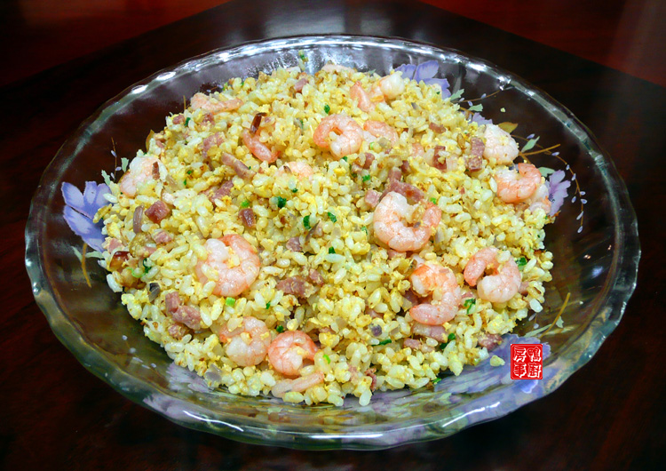 做法 :(1)蛋液里加入油葱酥一匙,葱花,盐半茶匙拌均,淋与米饭上拌均,放置5分钟;(2)虾仁过油捞起;(3)两大匙油烧热,放进洋葱/火腿炒香,倒进米饭翻炒至干身,加入虾仁快速拌炒均匀即可。