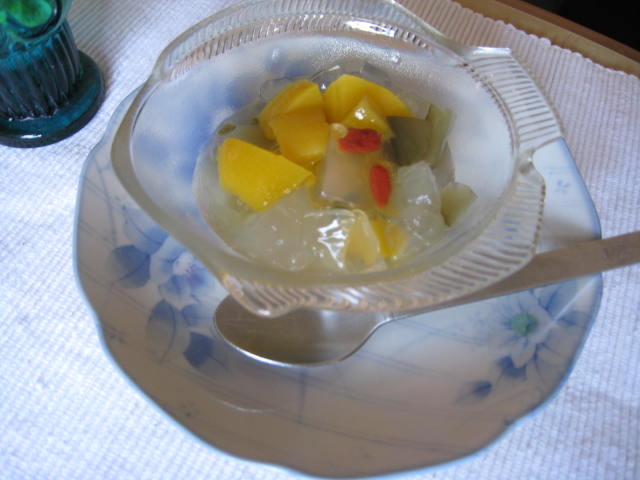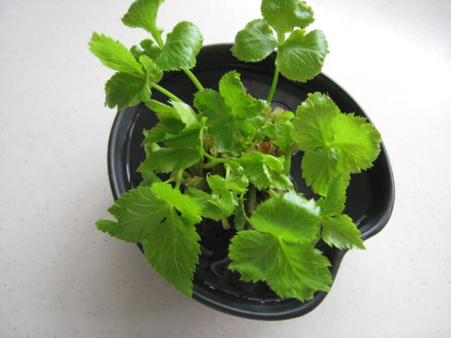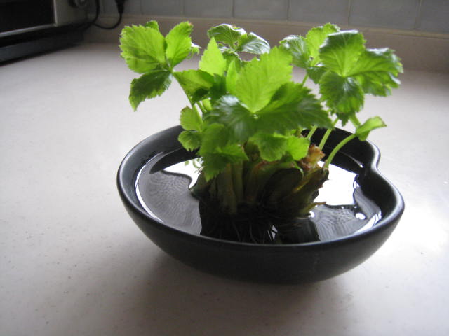 下面是日本超市裏買的《三葉菜》有點像水芹菜,把根部剪下之後浸在水裏就會長出新葉,放在廚房看著新綠也養眼。