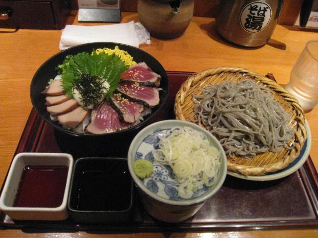 下面是一家蕎麥麵專門店,新鮮現磨的WASABI是特色。每張桌子上都有小塑料袋,希望客人把吃剩的WASABI帶回家。下面的吃法是把湯料都拌在面裏一起吃,叫《BUKAKE-SOBA》。