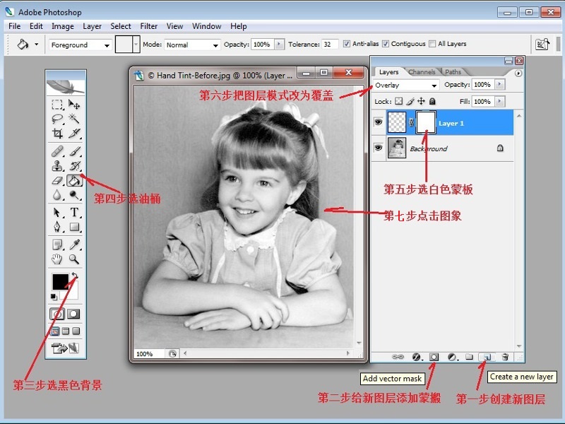 2。按如图所示的步骤,在加载的黑白照片的图象编辑器中创建一个空白带蒙版的图层。这个图层将用来为黑白照片各个部位着色。