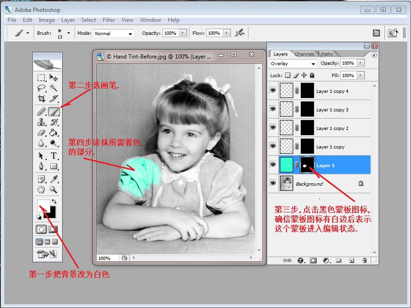 5。继续保持图层1编辑状态,按如图所示的步骤用画笔把填如颜色的图层蒙版涂抹成白色。着色的边缘部分尽量与原图保持一致。