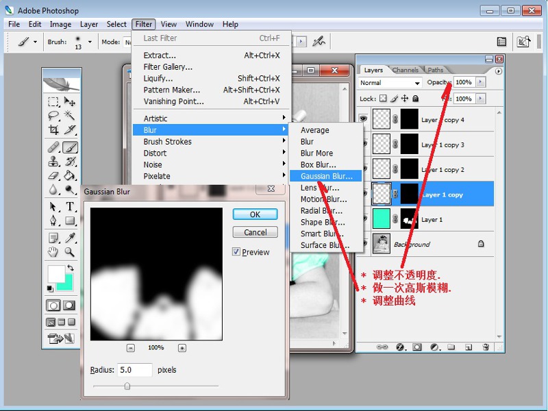 7。统调。 当完成全部着色后,需要对所有的图层和蒙板做一点调整。一是调整图层的不透明度,或者曲线(如果你知道怎么做)。二是做一次高斯模糊。半径选5就可以。如果对所选择的颜色不满意,可以用#4。的方法换颜色。直到满意为止。
