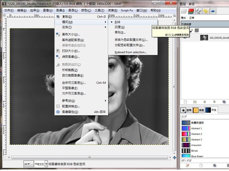 1。加载黑白照片的图象文件。注意:有的黑白照片是纯灰度图象。在开始着色编辑前,一定要把图象的模式改为RGB彩色模式。和Photoshop一样,否则折腾不出颜色来。