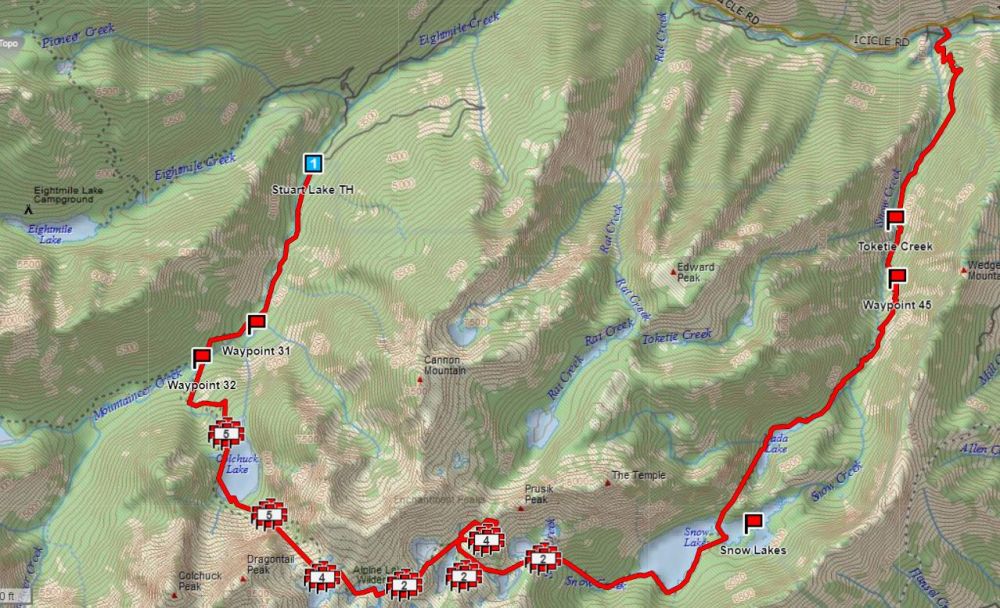 从这里到我这天的目的地 Colchuck 湖也就四英里,爬高 2200 英尺,所以我想天黑前到达没问题,时间早的话甚至有可能上山。(后来才知道四英里只是到湖的一头,到营地还要沿着狭长形的湖岸再走两英里到湖的另一头)不过我知道从湖边上山口 Aasgard Pass 的那一段可能是这条路上最难的一段。