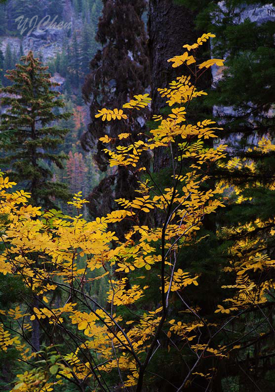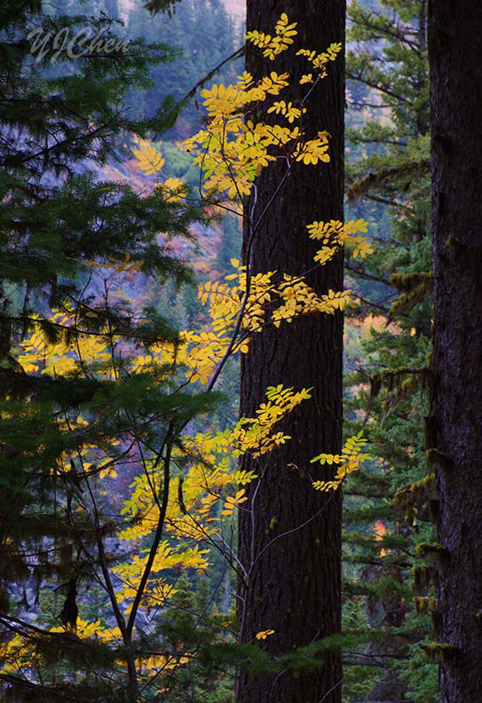 几年前曾经到过俄勒冈州和华盛顿州这样的温带雨林,当时似乎到得早了些天,森林里只是偶尔有些秋色,没想到这里的深秋如此动人。走在这样的树林里,真是一种享受。要不是为了早些到达营地,拿个相机我可以在这玩很久。