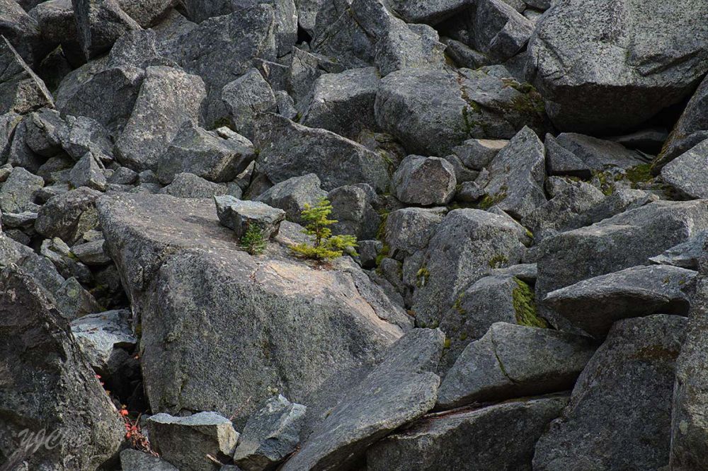 (9)我看了看 GPS 地图,快到湖了,开始明显爬高。走到一个独木桥前,见对面一大片森森的大石块,暗自心惊,想起读到过上山的路就先要翻过一片乱石堆,会不会就是这样的?独木桥没有栏杆,桥下是溪流。小心翼翼地过了桥,好在步道顺着巨石堆一边绕了过去。