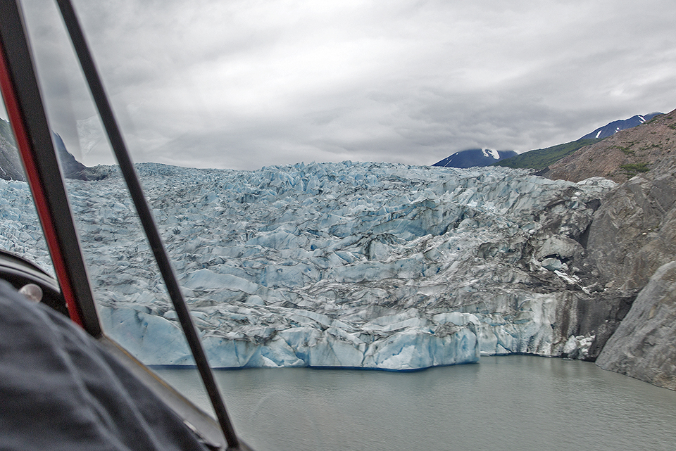 舷窗的玻璃让我的长焦距镜头十分受限制,而且玻璃的反光很影响聚焦和照片质量,Bob好像看见了我的难以施展,他在对讲机里问我,要不要把窗户打开拍照?我问他可以吗,他说让我试试。飞机左边的舷窗玻璃是滑动玻璃,比较容易打开,而右侧舷窗和舱门相连,要打开必须解开中间的插销。由于冰川在我们的右侧,他用一只手把方向,另一只手把右侧舷窗的插销打开,刚一打开舱门,大风立即就灌满了机舱,我把相机伸出窗外以最快的速度拍了几张冰川。