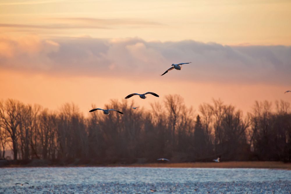 2. 天边刚开始泛红,有部分雪雁起飞,向着它们下一个目的地