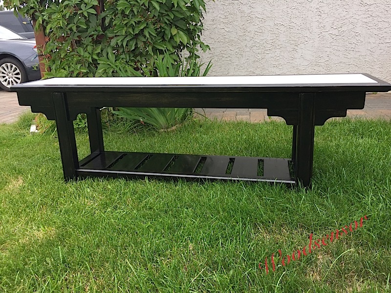 设计了一个仿造古典条案样式的电视柜,用松木和melamine的板子为材料制作,完成后的柜子长5英尺,宽一英尺,这是柜子做好后的样子: