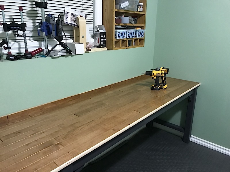 以前逛garage sale,买了一些枫木的实木地板,非常便宜,放在家里好几年,一直没有用。因为枫木很硬,是做桌子的很好的材料,我就用这些地板做了一面墙长的工作台面,长2.7米,桌子底下用的是普通spf木头。做好后,工作台底下上了灰黑色的latex。
