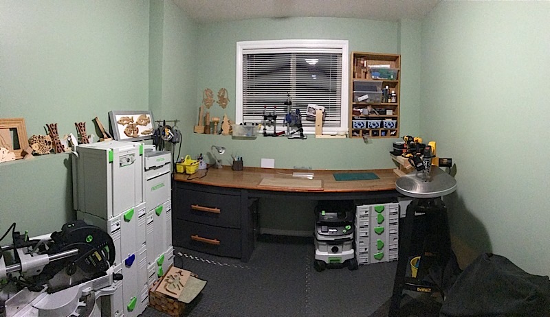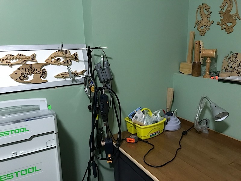 工作间里有一台scroll saw,一些小型工具,还有就是我的festool,基本都叠放在这个房间里的,图片里看看,还是比较乱的。