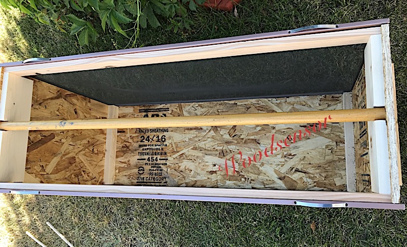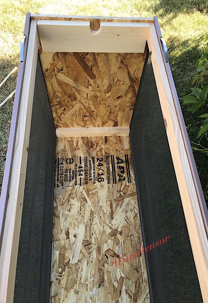 基本结构就是先用OSB板子先做一个3边的框架,两侧边把纱窗用螺丝拧到框架上,两头外侧再各装上一个木条,用做搬动箱子的拉手,两头内部再各钉上一个承接圆木棍的圆形凹槽木板。