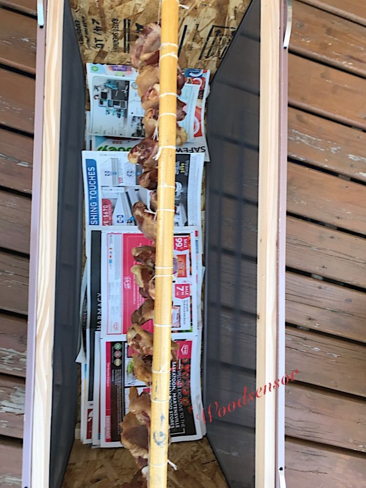 把要风干的肉用绳子穿入到原木棍上,然后放到两边的圆形槽中,然后把顶部夹板盖上,最后用把两根小圆木棍插入到原纱窗的弹簧圈里,这样正好可以把顶部盖板固定住。