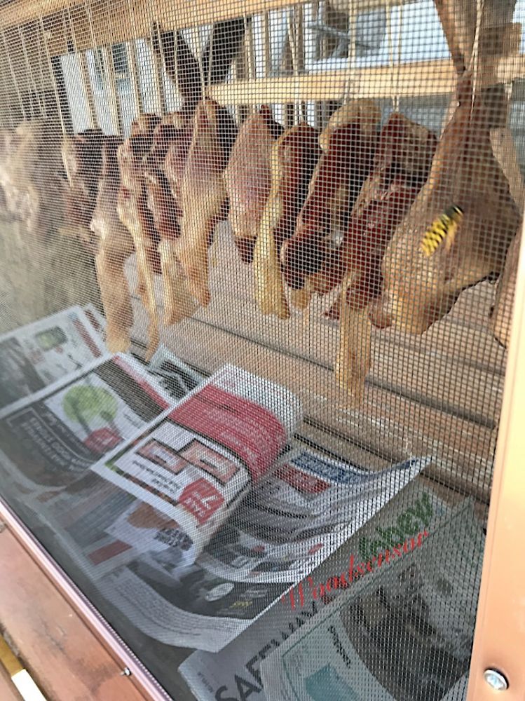 今天用几年前garage sale买来的2个纱窗($1),并用平时做木工留下的边角料,osb木板,夹板、和一个圆木棍,做了一个防虫透风的腌肉风干箱。