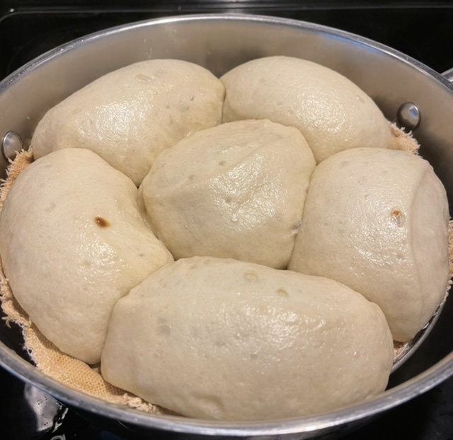 今天蒸了几个老面馒头,结果很成功。包饺子剩的面团在室温下自然发酵三夜。发酵后的面团体积增大了一倍,揉了一点点食用碱面。切好后蒸之前又自然发了20分钟,体积并没有增加。因为失去了耐心,索性放到锅里蒸。开大火,蒸汽上来后大火蒸15分钟。揭开锅后没有塌陷,体积增加了1.5倍。馒头的容貌朴实无华,确是一次成功的试验。