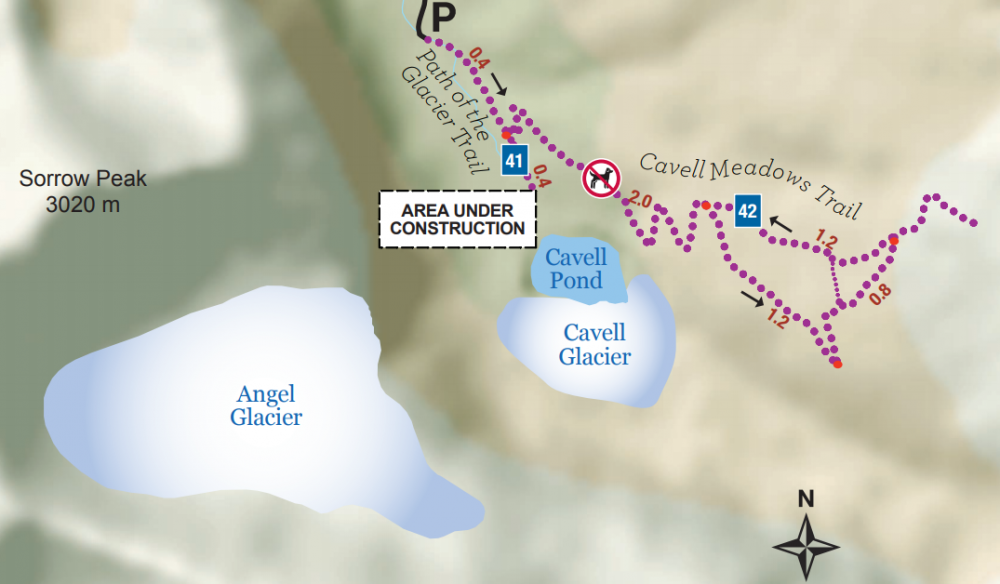 这里有两个trail 可走。Trail #41 (Path of the Glacier trail), 1.6km.走到头是Cavell Pond 和Angel Glacier。Trail #42 (Cavell Meadows trail),6-7km,这是一条上山的路,从一个高的角度观赏Angel Glacier。
