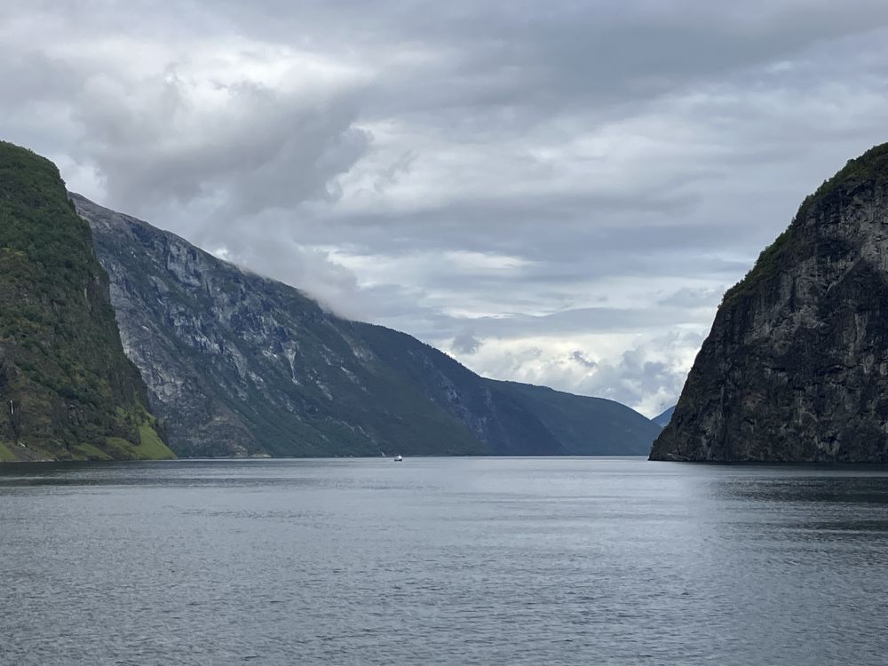 峡湾游船从Flam出发,经过Aurland艾于兰小镇和Undredal温勒尔达,最后到达Gudvangen,有的游船可以在艾于兰和温勒尔达码头停靠,上下游客,我们这个游船没有停。游船开始的一段是艾于兰峡湾,水面很宽,峡湾两侧高山耸立,山上覆盖着墨绿色的森林,许多条或细或粗的水流挂在山间,山腰坡缓的地方和山脚靠近水边,开垦出来的地方是浅绿色的草地或少量的农田,点缀其中的是星星点点的五彩农舍,明信片中的北欧田园风光,依山傍水,采菊东篱下,悠然见南山。