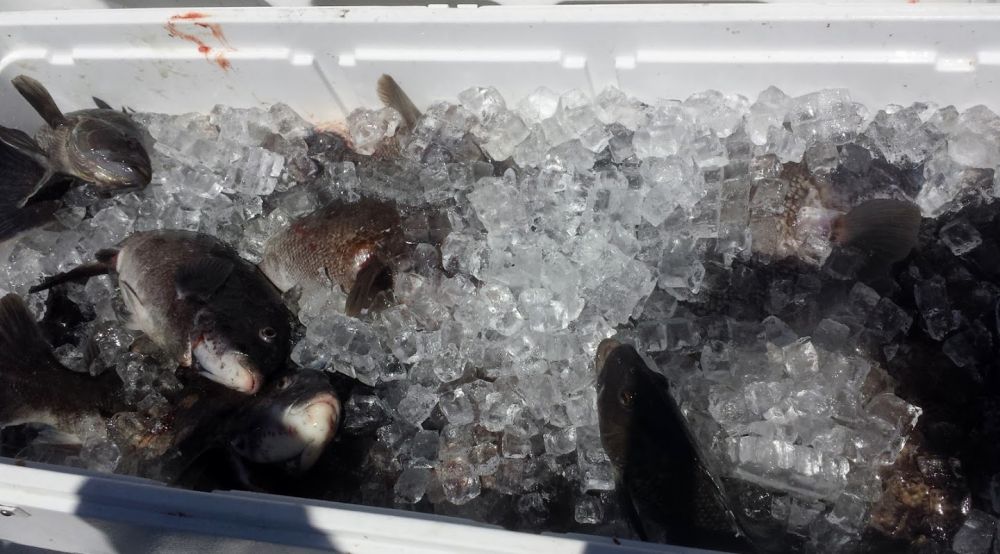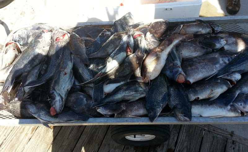 我们钓到的60多条大黑海鲈,还有3-4条一磅以上的鳕鳘鱼(ling fish)和7-8条青鲈鱼(cunner fish或bergall)