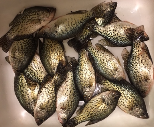 当我回到家以后,已经下午六点多钟了。人已经疲劳不堪,满脸的惓色。也不知道我当时是不是钓鱼钓疯了,脑子里突然浮出了钓莓鲈(crappie)的怪主意。更令人不解得是我一想到钓莓鲈全身的疲劳感竟然不翼而飞,身上又充满了用不完的力量。我试探着问我家领导:“我能再钓一会莓鲈吗?”此时领导正聚精会神地戴着耳机听歌曲。她似乎听见我说的什么,便无精打采地对着我扬了扬手,说:“去吧!去吧!不要回家太晩了。”我听了领导的回话后心中生喜,几步小跑就钻进了我的那匹铁马里。二十分钟后,我来到了钓莓鲈的钓点,竟然空旷旷的,四处静悄悄。我心想这么好的天气竟然没有人钓鱼,看来渔情不怎么样,抓紧时间甩两杆,如果没鱼马上回家。没想到天助我也。我的拟饵下水后游了没有多长时间就被鱼儿咬住不撒口了。我把鱼儿拉出水面,果然是条莓鲈。我喜出望外地摘鱼后再甩鱼杆,用匀速慢慢地收鱼线,砰地一下又上鱼了。也就是一个多小时,在太阳落山之时我竟然钓到了十五条莓鲈的限量。