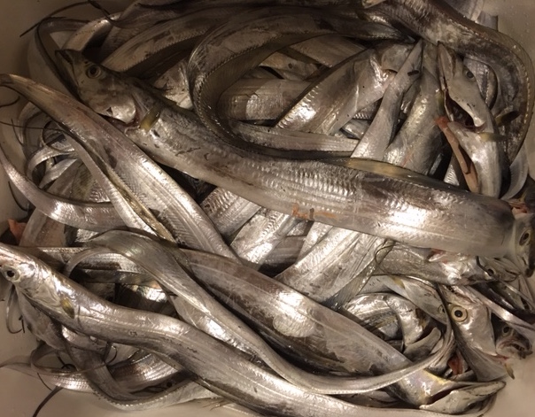 有了这条带鱼做鱼饵,我俩如虎添翼,在不到十分钟的时间内我钓到了两条带鱼,老郑钓到了一条。这三条带鱼个头都不小,有三指宽哪。