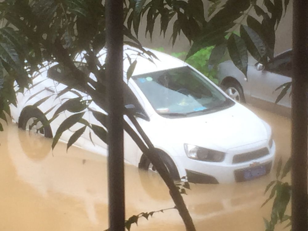 这种情况下,想出门是“门也没有的“,只能呆在家里。又值得庆幸的是,我们住在二楼,下面汪洋一片,我们却安然无恙。假如是住一楼,那很可能屋里头就要进水了。从窗户看出去,周围居民家的小车都泡在了水里。